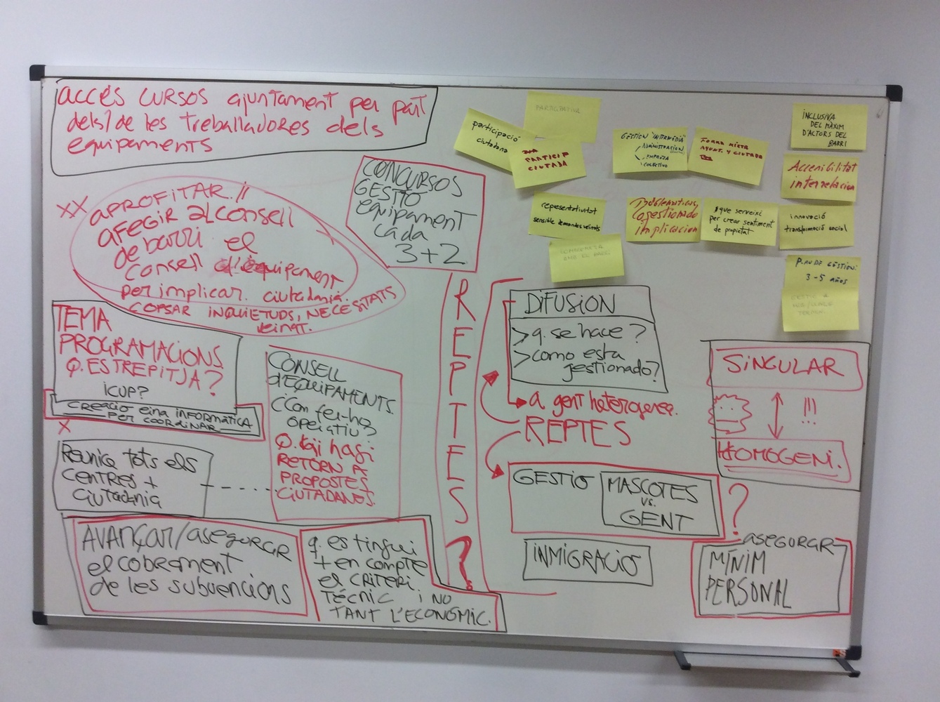 La data no ha facilitat l’assistència de la ciutadania ja que s’ha iniciat la setmana de setmana santa i no hi ha activitat al centre cívic.La sessió ha transcorregut en un clima constructiu i amb un alt grau d’acord. El fet que fóssim un grup reduït, en un primer moment ha semblat que generava certa desesperança, però finalment ha permès aprofundir en un tema complex com és la gestió cívica del equipaments de proximitat.El perfil dels assistents ha estat divers en edat, social, polític, professional (han participat representants de partits polítics, treballadores de centres cívics, representants d’entitats i associacions i veïnes)Comencem contextualitzant col·lectivament el tema del debat amb la pregunta: “de que parlem quan parlem de Gestió Cívica”, models al camp:· Descentralitzada· Punt entremig on entra una opció híbrida tècnics/ciutadania· Gestió ciutadana· Cessió d’ús d’un espai que es gestionat per un col·lectiuTemes recurrents:· Gestió cívica d’horts urbans i equipaments, centres de salut.· El paper dels immigrants i d’altres col·lectius, així com dels infants· Gestió dels Parcs (presència de persones amb mascotes, genera moltes reaccions, hi ha posicions que generen conflicte).2.- Cerca de punts de consens entorn la gestió d’equipaments de proximitat. Debat sobre diferents perspectives.Punts de consens: Gestió cívica es:· Participació ciutadana,· Els assistents aposten per un model mixt de gestió, amb tècnics i col·lectius, ciutadans o empreses.· Aprofundir en el debat gestió directe/indirecte· Ha de representar les diferents sensibilitats i i tipus de població, incloent la màxima pluralitat d’actors del barri (els infants, immigrants-cuidadores que treballen al barri tot i que no hi viuen)· Al barri trobem que hi ha un col·lectiu d’immigrants important que cuiden de la gent gran, cal veure com implicar-los?· Ha de ser fluida la comunicació amb l’exterior· Ha de ser sensible a les demandes veïnals i compromesa amb el barri (“no pot venir algú que no està interessat que es el barri i treballar per l’entitat”); que generi i promogui al ciutadà un sentiment de pertinença del barri i de l’espai públic.· Ha d’estar basada en una gestió planificada a mig i llarg termini per part de les entitats.· Ha de promoure la innovació a través de la participació de la diversitat de les veïnes....)· Ha de tenir una representació flexible a les demandes veïnals. Ha de visualitzar els conflictes/problemes que hi han en el barri i facilitar la seva resolució, fent sentir que serveix d’alguna cosa.i punts de desacord· El nivell de gestió més o menys privat· Cal generar eines que facilitin el treball i la gestió de les entitats respectant la singularitat de cada projecte i no homogeneïtzar tots els projectes.Es van alternar moments de propostes amb moments de preguntes a les persones que tenien més informació sobre la gestió cívica (cal més informació sobre que es exactament gestió cívica).Al final a partir d’una posada en comú i un ampli debat treballem per generar propostes.