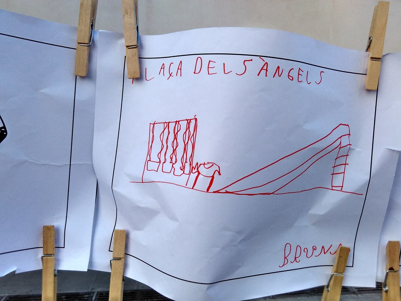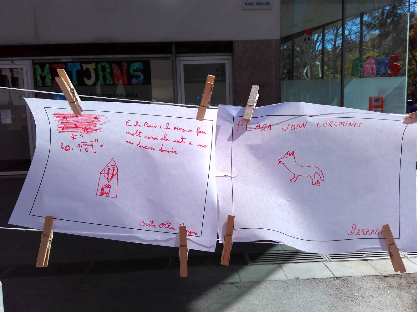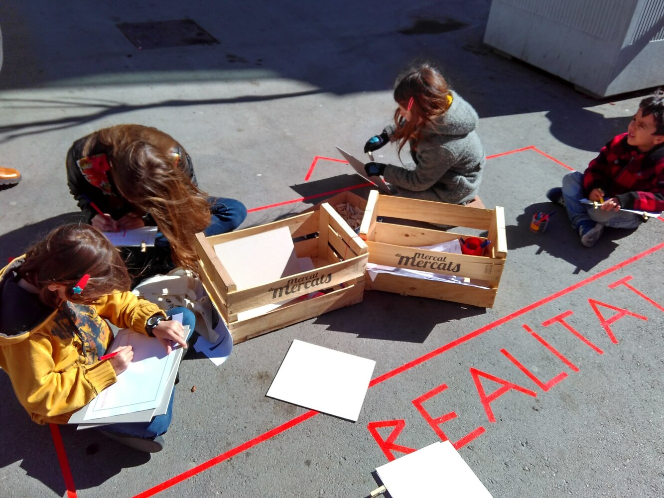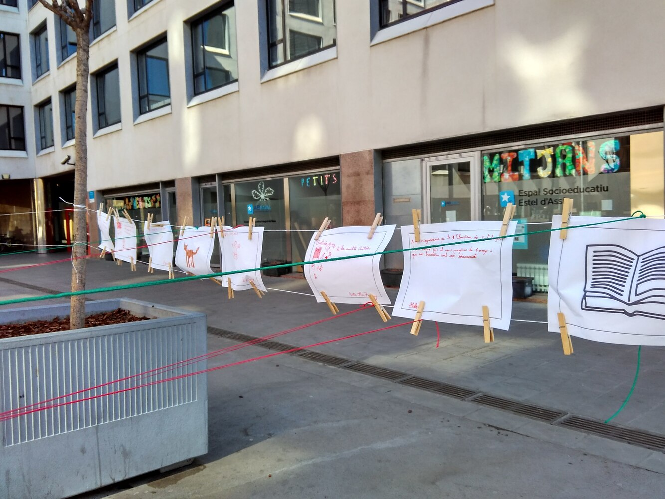Aprofitant el mobiliari urbà (10 jardineres) de la plaça s’estableixen dues fileres de cordills enfrontades que serviran per anar penjant tot allò que els nens i nenes pensen sobre el barri.REALITAT: En una filera els infants hi pengin els noms dels llocs dels quals volen opinar i l’altra, enfrontada a la primera, i en l’altra hi pengen (de forma dibuixada o escrita) la seva opinió sobre el lloc (aspectes negatius i postius, etc.). Mitjançant cordill de color connectaran el lloc amb la seva opinió. Amb vermell connectaran els aspectes negatius i amb verd els postius.