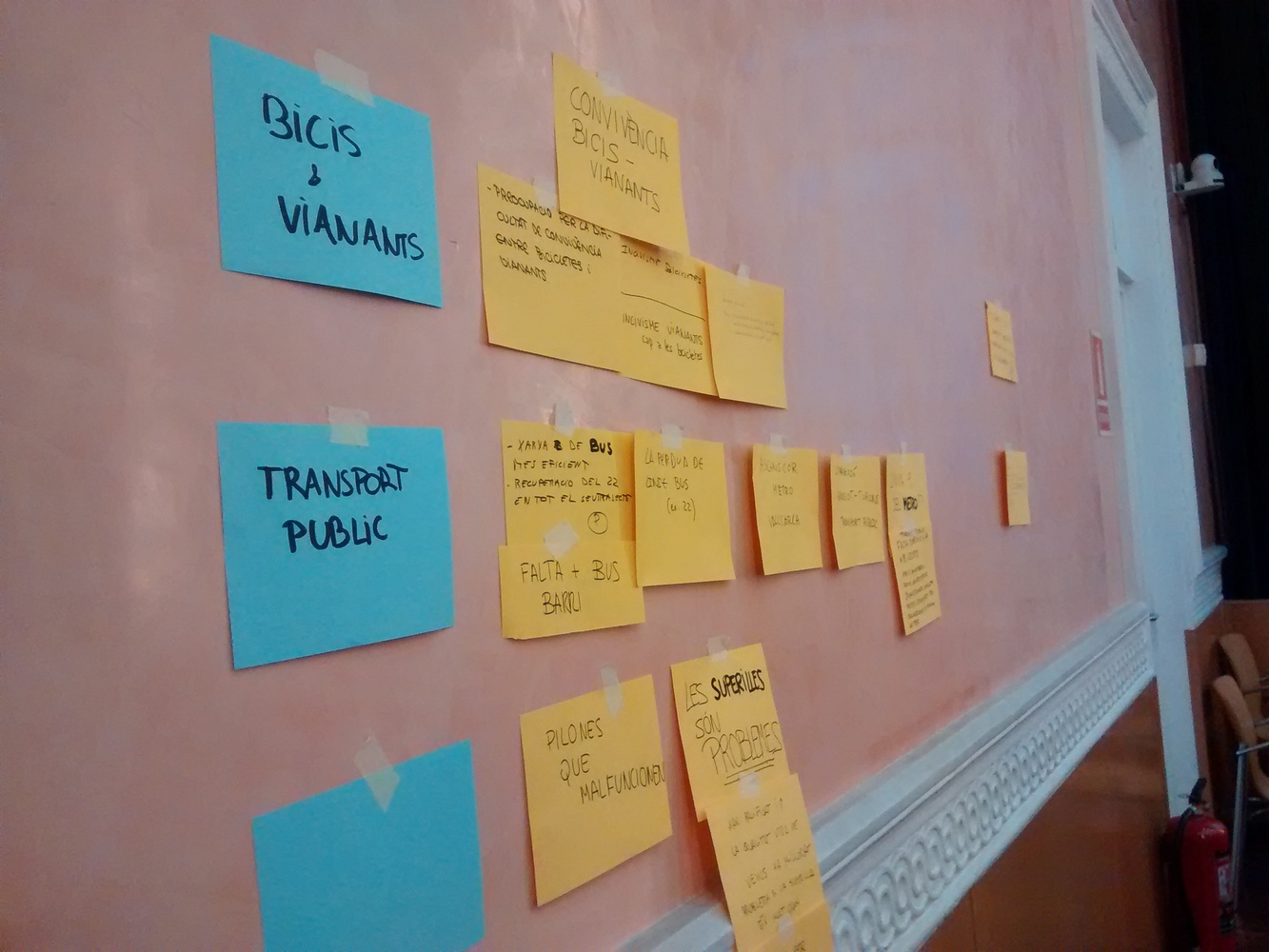 La sessió es va realitzar en un sol grup per treballar el diagnòstic i les propostes sobre 4 blocs: Vianants / Transport públic / Transport privat /Espai públic (mobilitat als carrers).El primer dubte que va sorgir és que la mobilitat s’hauria de plantejar en l’àmbit de ciutat, i a escala global. Però es recorda que es pot discutir sobre la mobilitat a totes les escales de la ciutat (carrer, barri i ciutat)Respecte a la situació actual ens trobem que el que genera més discussió és la situació actual de la superilla C2. Segons alguns veïns la idea de generar superilles queda molt bé a nivell teòric, però no funciona en la vida quotidiana dels veïns. Es crea congestió en carrers on no hi havia anteriorment, i per arribar a certs llocs s’hauria de donar moltes voltes.El següent tema important de discussió vas ser la relació entre els vianants i les bicicletes. Es va dir que per part dels vianants no hi ha cultura de la bicicleta i no es respecten als usuaris , però per part dels vianants, es va criticar l’ús de la bicicleta en als carres amb plataforma única.Altre tema important va ser el paper dels vianants al carrer. En el cas de la plataforma única, els vianants van pel mig perquè tenen prioritat respecte al cotxe. Però es produeixen situacions tals com que als pares no li agraden deixar sols als nens en aquest tipus de carrer, perquè pot arribar a ser més perillós. Hi ha conflicte entre vianants (avis, fills, pares) i vehicles motoritzats.“Una idea general durant tota la sessió va ser que el primer són les persones. Aquests haurian de ser el centre de la mobilitat, i a partir d’aquí desenvolupar els projectes. Alguns van dir que s’haurien d’aprofitar els carrers tal com els tenim”El tema de la contaminació generada pel transport, es va parlar molt poc, únicament pe l’usuari de la bicicleta.Com a idea general, també es va plantejar la millora del transport públic, demanant metro, més línies de bus i recuperar el bus 22.A continuació es fa la llista de les propostes segons la seva temàtica i suport.