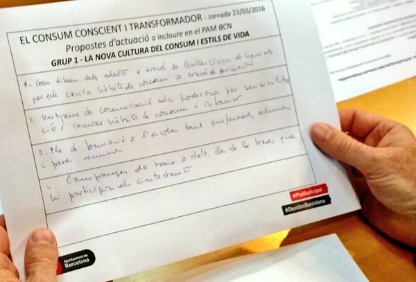L’objectiu era compartir punts de vista en aquests àmbits, debatre prioritats i identificar i construir propostes d’actuacions de forma conjunta per tal de poder incorporar-les al PAM. Transcorregut aquest temps, cada grup va abordar un altre tema, de manera que al final de la sessió totes les persones participants van treballar els 4 àmbits. A més, cada grup va poder construir propostes en base a les ja elaborades pels grups que prèviament havien tractat un tema en qüestió.Al final de la sessió, una persona relatora de cada equip va presentar en plenari totes les propostes elaborades. Finalment, el Comissionat va fer el tancament de la sessió i va passar la paraula a Toni Lodeiro, qui va presentar el Pla d’impuls del consum responsable, que l’Ajuntament de Barcelona està elaborant participadament.