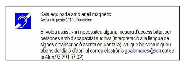 Sala equipada amb anell magnètic Activar la posició “T” a l’audiòfon Si voleu assistir-hi i necessiteu alguna mesura d’accessibilitat per persones amb discapacitat auditiva, cal que ho comuniqueu abans del dia 5 d’abril al correu electrònic gpalomares@bcn.cat o al telèfon 93 291 57 02