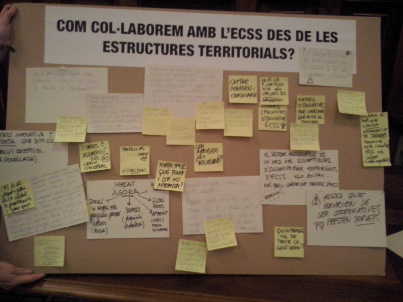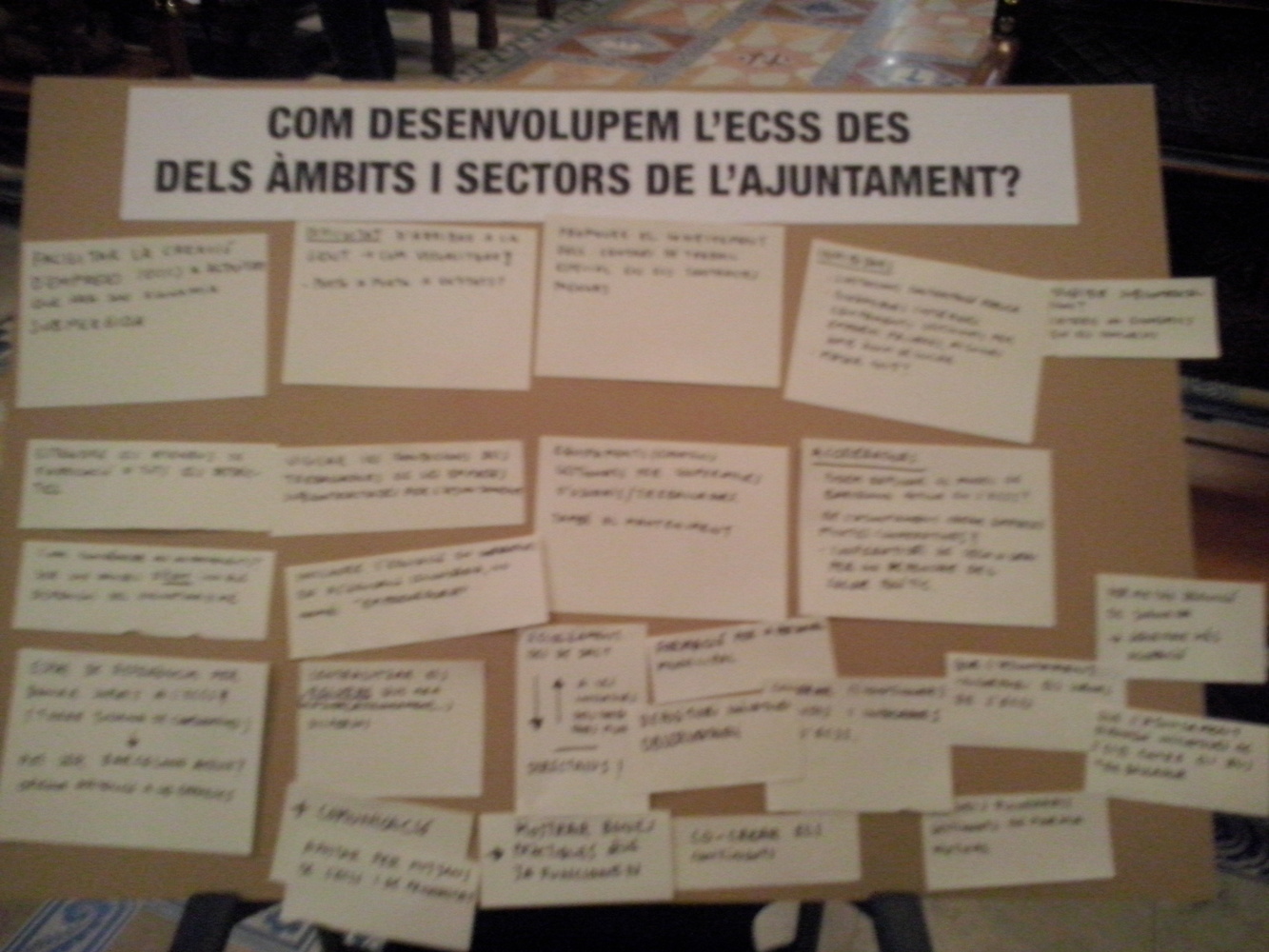 El debat va començar amb la intervenció de Xavier Rubio Cano (Tècnic de projectes d’Altres Economies) i Jordi Via (Comissionat d’Economia Cooperativa, Social i Solidària i Consum) amb una presentació introductòria sobre l’economia social, solidària i cooperativa (ECSS), assenyalant com objectius del debat com es pot reforçar, fomentar i fer més visible des dels diferents àmbits de l’ajuntament i de la ciutat i, remarcant la voluntat i la necessitat d’incloure els treballadors municipals de les diferents àrees.Després es va treballar en 3 grups simultanis de 7-8 persones entorn 3 preguntes: Com desenvolupem l’ECSS des dels àmbits i sectors de l’Ajuntament? Com col·laborem amb l’ECSS des dels equipaments culturals, esportius, socials, etc.? i Com col·laborem amb l’ECSS des de les estructures territorials? Per tal que tothom participés en el debat de cada dimensió, es van fer 3 rondes d’uns 30 min. després de cadascuna de les quals els participants canviaven de taula i es barrejaven.Finalment, en plenari, les dinamitzadores i el dinamitzador de LaCol van exposar les principals reflexions i propostes plantejades en relació a cada una de les preguntes.El debat, a les diferents taules va girar entorn com treballar perquè l’ajuntament incorpori els valors i criteris de l’ECSS (com empresa cap als treballadors i treballadores) però també com a un dels principals clients de la ciutat, com a contractant de serveis. L’ajuntament com a gran client de la ciutat podria tenir molta capacitat per impulsar i donar visibilitat a iniciatives de l’ECSS però l’actual normativa de contractació, en la que l’oferta econòmica esdevé determinant, deixa poc marge per incorporar i fer decisius els valors socials. Es proposen dues estratègies: refer la llei o aprofitar les escletxes per incorporar empreses i iniciatives a les licitacions. En qualsevol cas, es proposa acabar amb les subcontractacions que suposen perdre el control sobre aspectes fonamentals com les condicions dels treballadors/es subcontractats/des.Respecte els equipaments, es van plantejar propostes a l’entorn de l’optimització dels espais, la gestió i l’orientació al bé comú. Es proposa la cessió d’espais per a la difusió d’iniciatives de l’ECSS. Es pensa molt en centre cívics, però també en mercats o espais com l’ICUB .Els equipaments també poden tenir un paper en la incorporació mitjançant la pràctica amb fórmules de cogestió amb els usuaris de les instal·lacions i el se manteniment (p.e. en centres esportius) o en gestió promovent condicions perquè les licitacions de manteniment puguin ser desenvolupades per empreses del territori. Es proposa també convertir els mercats municipals en àgores, que incorporin i difonguin iniciatives d’ECSS i connectin amb les necessitats i projectes del territori.Per donar suport des de l’estructura municipal a les iniciatives al territori van aparèixer dues modalitats: una de centralització dels recursos (actualment dispersos) d’informació, orientació, suport i seguiment (en una mena de Torre Jussana de l’ECSS) i d’altra banda es proposa acostar els recursos allà on es generen les iniciatives, treballant des dels districtes amb l’entorn més proper. Es tracta d’escoltar, conèixer i coordinar. Generar espais on els projectes prenguin forma. Es proposa una figura que articuli el coneixement del que passa al teixit social i connecti i coordini amb els recursos i serveis municipals per a fer que els projectes prenguin forma, es desenvolupin, es repliquin etc.Pel que fa a la difusió i comunicació les propostes plantejaven utilitzar els mitjans públics per donar a conèixer les iniciatives de l’ECSS: es menciona concretament les pantalles dels equipaments, del transport públic o les cares B de les banderoles, però també cedint espais dels equipaments o utilitzar l’espai públic com altaveu. El repte és convèncer els no convençuts, arribar a les persones que desconeixen o no estan sensibilitzats amb experiències d’ECSS. En aquest sentit es proposa l’educació dels diferents esferes socials, des d’entitats com les AMPAs fins als centres educatius i els treballadors públics.En relació a la difusió es va plantejar no deixar de banda col·lectius com la gent gran, que a més de receptors d’iniciatives de l’ECSS (cooperatives de consum, d’atenció i cures, etc) poden ser protagonistes actius de projectes.Finalment, va estar present a diferents propostes la reflexió sobre potencial del teixit associatiu, és un dels més susceptibles d’incorporar experiències d’ECSS (p.e. les AMPAs). De vegades però, les entitats desconfien de l’ajuntament i per por a que aquest s’apropiï de les seves experiències eviten col·laborar-hi. En d’altres casos, el fet que rebre una subvenció pública impliqui fer figurar el logo de l’administració genera rebuig. Aquestes dificultats s’han de treballar i superar des de les estructures més properes (barris, districtes) per generar confiança i col·laboració, per sumar. D’altra banda també s’assenyala que cal anar amb compte perquè hi ha associacions que pels serveis que presten haurien de ser cooperatives.Per acabar, es recull un toc d'atenció respecte els canals oberts de participació al procés del PAM:Què passa amb les persones no entren al web? Cal tenir en compte que a Barcelona l’escletxa digital té una dimensió territorial important.Les associacions de veïns, han fet un procés participatiu amb els veïns dels seus barris per elaborar les propostes que presenten al PAM?