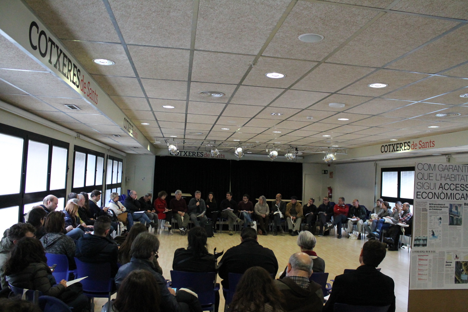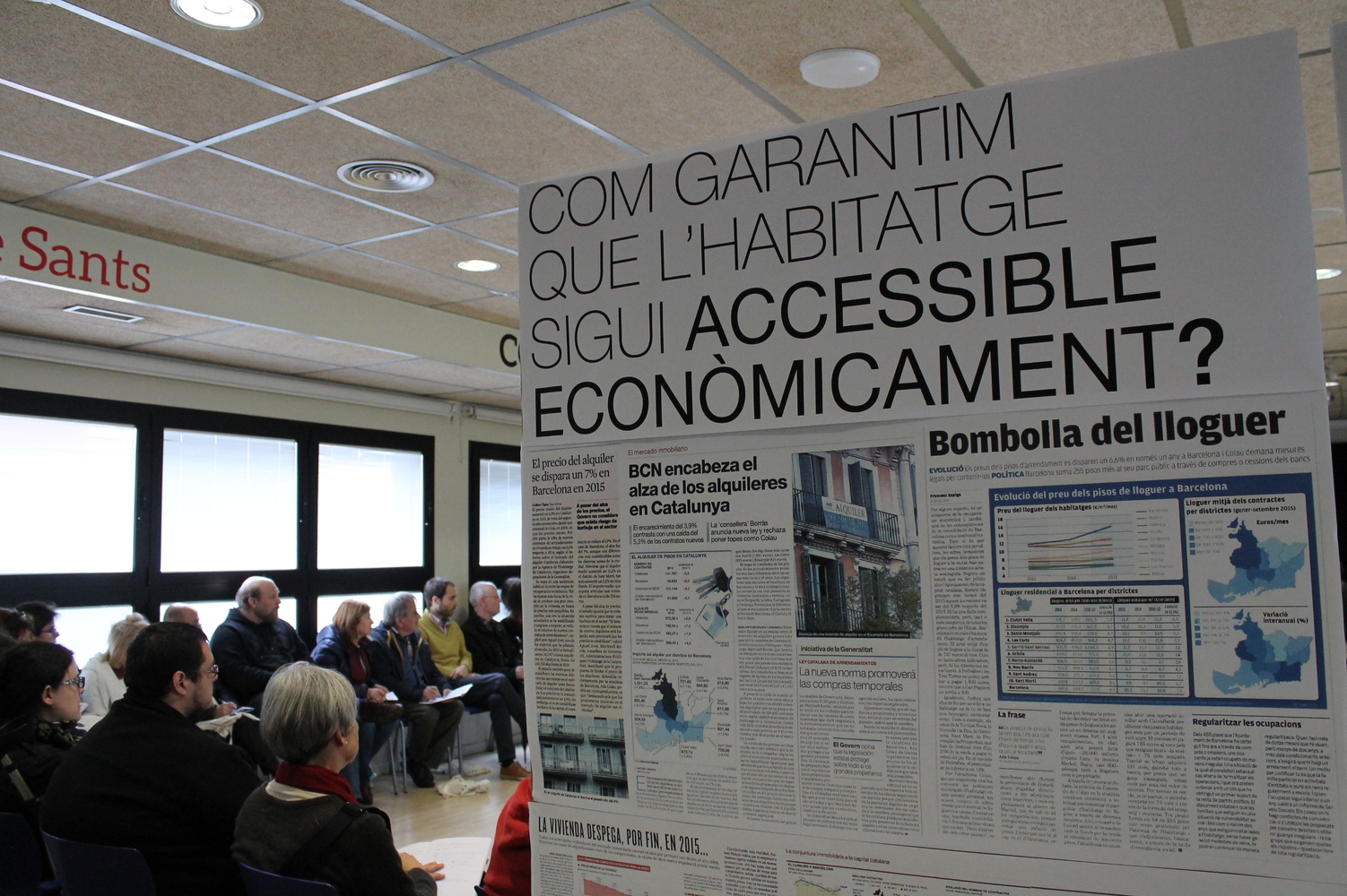 Video resumÀudio de les presentacions inicialsDocument amb les propostes d'habitatgeNotíciesUns 200 veïns debaten a Sants amb Ada Colau com aconseguir que l’habitatge sigui un dretColau vuelve a casaReivindicant l’habitatge com a dretAssisteixen a l'acte unes 200 persones. Ciutadans a títol individual, personal tècnic i polític de l'Ajuntament de Barcelona i altres administracions, i representants d'empreses i entitats, de les quals (inscrites prèviament i per ordre alfabètic): Associació 500x20, AVV La Sagrera, AAVV Poblenou, Abitaresociale, ARDIS, Asociación Centro Boliviano Catalán, Buildingcenter, CaixaBank, Casal dels infants, CCOO Baix Llobregat, Celobert SCCL, Centre Social de Sants, Col·legi d'Arquitectes de Catalunya, Comunitaria SCCL, Cooperativa Fem Ciutat, Creu Roja, Earthship Spain, Encajes urbanos, ETSAV, Fira de Barcelona, Fundació Ara Vincle, Fundació Foment de l'Habitatge Social, Fundació Hàbitat3, Fundació MAIN, JCC, laboqueria taller d'arquitectura SCCL, Llar Unió Catalònia SCCL, Plataforma Derecho Vivienda Digna, OIKOSVIA ARQUITECTURA S.C.C.L, RMIT Europe, Sant Joan de Déu.L'acte comença amb la benvinguda de l'alcaldessa Ada Colau, seguidament el regidor d'habitatge Josep Maria Montaner introdueix el Pla d'Habitatge i Núria Colomé presenta el resultat del treball fet a nivell de districtes. Després d'una pausa els participants es dividixen en quatre grups de treball: emergència habitacional, com fer efectiva la funció social de l’habitatge, habitatge assequible i rehabilitació. En cada grup comença un representat de l'àrea d'habitatge fent una presentació de l'eix. A continuació una entitat implicada en cada tema presenta qüestions específiques dels grups de treball. La mateixa entitat desenvolupa la tasca de relatora quan al final de l'acte es posa en comú les conclusions de cada grup.PRESENTACIÓ DE L'ALCALDESSA ADA COLAUL'alcaldessa recorda que l’habitatge és “una de les màximes prioritats per aquest govern”, per això “ha arribat el moment de tractar l’habitatge com a dret”. Colau va criticar el “fracàs de la mercantilització de l’habitatge”, per part de les administracions públiques en els darrers anys i va demanar fugir d’aquest model: “A totes les grans ciutats de l’estat no s’ha apostat per un parc públic de lloguer social i per alternatives habitacionals que considerin l’habitatge com un dret, abans que com una mercaderia” recalcava. Actualment, segons Colau, “les polítiques especulatives”, han estat producte “d’una mentalitat i cultura, on es va buscar una certa complicitat social, és a dir, una propaganda on es convencia a la població que mercantilitzar l’habitatge era un bon negoci per tothom”. Es posa èmfasis doncs en que cal un canvi de mentalitat (com el paradigma de la propietat com a solució habitacional) i utilitzar les lleis per garantir l'accés a l'habitatge.PRESENTACIÓ DEL REGIDOR D'HABITATGE JOSEP MARIA MONTANEREl regidor presenta les línies principals del Pla pel Dret de l'Habitatge Digne 2016-2026.A. Atendre i revertir l'emergència habitacionalNecessitem intervenir en 2 línies bàsiques: a través de la prevenció per evitar arribar a situacions d'emergència habitacional i de l'atenció a les persones quan no s'ha pogut evitar que s'arribi a una situació límit.Prevenir per evitar l'emergència habitacional: Ajuts al lloguer