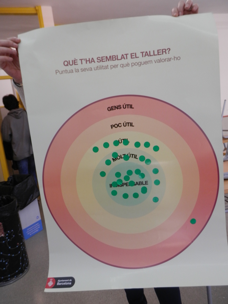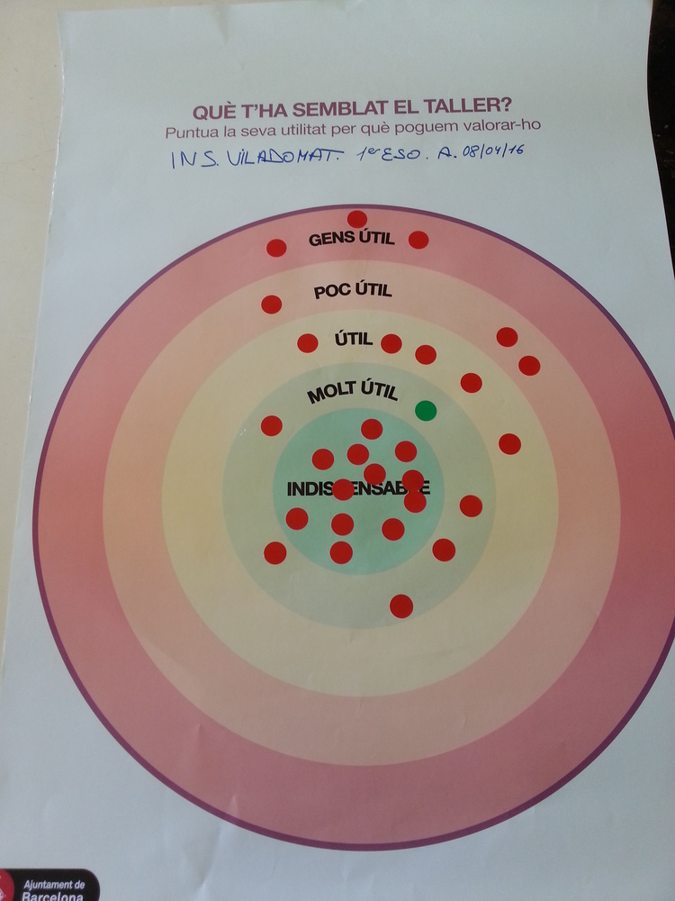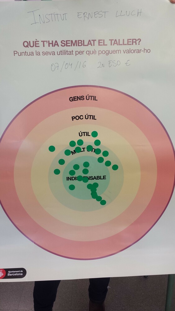 Els debats als Instituts Viladomat, Poeta Maragall i Ernest Lluch entre el dilluns 4 d'abril i el divendres 8 d'abril (en total 9 debats adreçat a 243 alumnes) s’han desenvolupat simulant consells de districte, a on hi havia diferents rols de ciutadania associada (associació de veïns, moviment okupa, comerciats...) i grups polítics. Cada grup realitzava propostes i n’acordava una per exposar a plenari. En la fase de plenari s’ha realitzat un procés de deliberació de les propostes per part de tots els participants i votació de les mateixes per part del grup polític.Amb aquest procés s’ha pogut exercitar la participació realitzant iniciatives ciutadanes, deliberar-les i votar-les.Tot i l'elevat nombre d'alumnes per aula (entre 25 i 30) s'ha pogut dur a terme la dinàmica participativa, presentar i formular propostes i deliberar-les.Al finalitzar, els participants han pogut valorar les sessions, les quals han estat molt ben valorades en general.A continuació presentem propostes recollides en les sessions als instituts. Algunes de les propostes del diferents centres han estat molt similars, per la qual cosa han estat agrupades en una de sola. Altres propostes ja estaven recollides prèviament en el web amb una denominació similar.