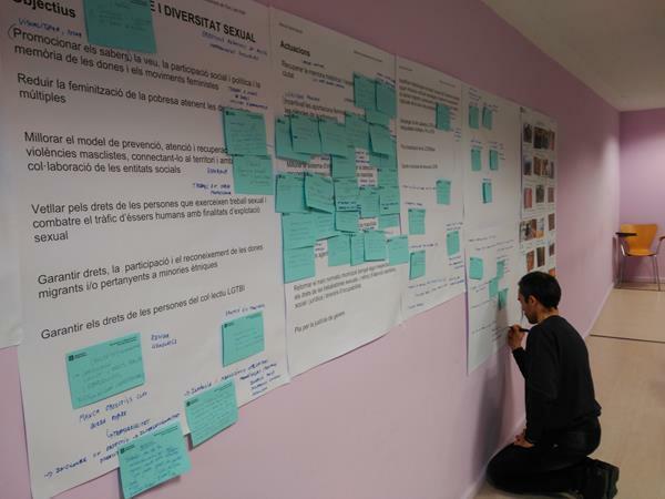 La sessió tenia per finalitat contrastar i enriquir la proposta inicial del PAM en l’àmbit de l’Equitat de gènere i diversitat sexual. Per aquest motiu, la sessió es va estructurar en dos moments clarament diferenciats. Un primer moment de presentació, on un responsable de l’ajuntament de Barcelona, Marta Cruells, va presentar i contextualitzar la proposta global del PAM 2016-2019, així com dels objectius i les propostes d'actuació que contempla en relació a l'àmbit de l’Equitat de gènere i la diversitat sexual. I un segon moment de treball, on els i les participants dividits en 4 subgrups van elaborar les seves propostes de millora.El treball en grups es va articular a partir de dues reflexions. Una primera reflexió convidava a imaginar i projectar com seria l’escenari de futur desitjat l’any 2019 en relació a l’Equitat de gènere i la diversitat sexual a la ciutat de Barcelona. Es tractava doncs d’imaginar com ens agradaria que fos la ciutat ideal en aquest àmbit i amb l’ajut de diferents imatges inspiradores els i les participants van definir el seu escenari desitjat que es caracteritzava per ser:- Una ciutat que tingui les bases estructurals de les polítiques d’igualtat ben consolidades- Una ciutat que generi noves oportunitats per les noves generacions per poder tenir una bona qualitat de vida. Que aposti pel futur- Que la cura i el benestar de les persones estigui en el centre de les polítiques per tal de superar desigualtats- Que aprofiti el millor del passat i sàpiga aprofitar el que està per venir. Interseccionalitat- Que posi en valor i la riquesa de la diversitat i el treball en xarxa- Que sigui una societat més oberta i sensibilitzada amb la igualtat de gènere i diversitat sexual- Una ciutat que tingui un rumb clar en aquest àmbit- Una ciutat que tingui capacitat per superar les dificultats i reptes que se li planteja- Una ciutat que sumi esforços de tothom.- Una ciutat tranquil·la i amable, que generi felicitat- Una ciutat més lliure i respectuosa- Una ciutat més assossegada. Que respecti els ritmes i on es pugui conciliar millor- Una ciutat amb capacitat d’afrontar els canvis i treballar amb un ritme més pausat- Una ciutat càlida i acollidora- Una ciutat que transforma amb esperança-Tot seguit, i tenint en compte l'escenari desitjat, es va convidar als i les participants a que revisessin els objectius i les actuacions recollides a l'àmbit de justícia social, per valorar si la proposta ens acostava o allunyava d’aquest escenari. Es tractava doncs de recollir matisos, concrecions o noves propostes que poguessin millorar la proposta inicial presentada.Finalment, els dinamitzadors van fer un repàs de les aportacions recollides.Durant la sessió van sorgir aportacions diverses en un ambient de treball que va ser molt positiu i constructiu.