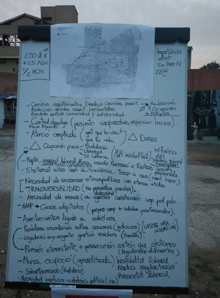 Els i les assistents al debat pertanyen a àmbits molt diversos. Hi ha representació d’entitats que treballen amb població migrada, entitats i associacions veïnals, representació de l’administració i també persones que viuen a assentaments.Actualment existeixen més de 25 assentaments al Districte de Sant Martí (la meitat del volum d’assentaments de tota la ciutat), on viuen aproximadament 250 persones de les quals 40 són infants.Els i les participants al debat manifesten que hi ha hagut un canvi de tendència en les situacions d’infrahabitatge: s’ha produït un traspàs de gent prèviament resident en assentaments a pisos ocupats. Hi ha qui denomina aquest fenomen “assentaments verticals” (pisos ocupats). Aquesta nova realitat està més invisibilitzada i diversificada en la zona d’influència de la ciutat (hi ha molta permeabilitat a l’àrea Metropolitana, sobretot al Llobregat, Besòs, Santa Coloma), fet que fa necessari el treball coordinat de les diferents administracions. A causa del desallotjament dels grans assentaments, hi ha hagut una reubicació que fa que s’hagi passat d’una ocupació a ocupacions múltiples, el que ha donat lloc a una pèrdua del sentit de comunitat i solidaritat. Aquest canvi de pràctica i forma dels assentaments ha trencat diferents mites, com per exemple el mite de la itinerància i planteja la necessitat de pensar els assentaments no de manera individual sinó en connexió amb les característiques concretes dels col·lectius que hi viuen.Un dels grans reptes envers el que han reflexionat totes les persones del grup és el problema de l’ocupació i la inserció laboral. S’expressa una manca d’ocupació generalitzada, que genera inestabilitat i precarietat laboral que moltes vegades afecta la regulació i fins i tot pèrdua de permisos. En relació amb aquest punt, es percep una manca d’assoliment en la formació de les persones migrades per factors socials i personals externs i per problemes de sincronització entre l’administració i temps vital de les persones. A més hi ha una sensació generalitzada d’excés de formació sense especialització i de manca d’acreditacions de competències pròpies de les persones migrades. Per tant s’argumenta la necessitat del fet que l’administració ofereixi formació adaptada a les competències pròpies de les persones amb una diversificació de les sortides professionals.Es creu necessari un treball transversal des de l’administració per tal de crear un projecte adaptat i acotat a la problemàtica, que sigui innovador i amb unes polítiques públiques coproduïdes amb la població i els col·lectius afectats. Tot i que des de la representació de l’ajuntament al debat, es justifica que hi ha hagut una ampliació de l’atenció no només cap a persones que viuen als assentaments, sinó persones que hi ha viscut o que en fan ús sense residir, a més d’ampliar el treball amb les dones.En relació a la ferralla, s’ha parlat dels problemes de salubritat associats a aquesta pràctica i de la rigorositat de les legislacions per optar a l'opció de treballar com a cooperativa en aquest àmbit (tractament de residus).Un col·lectiu molt present al debat ha sigut el col·lectiu de Galaics al qual s’ha fet referència en relació a un problema d’acumulació de multes per recollida de paper que representa un llast per la seva inserció, a més de comptar, segons es planteja al debat, amb una forta pressió per part de l’administració en la recollida del cartó, mes que en la ferralla, es creu que per temes de diferències en la legislació.