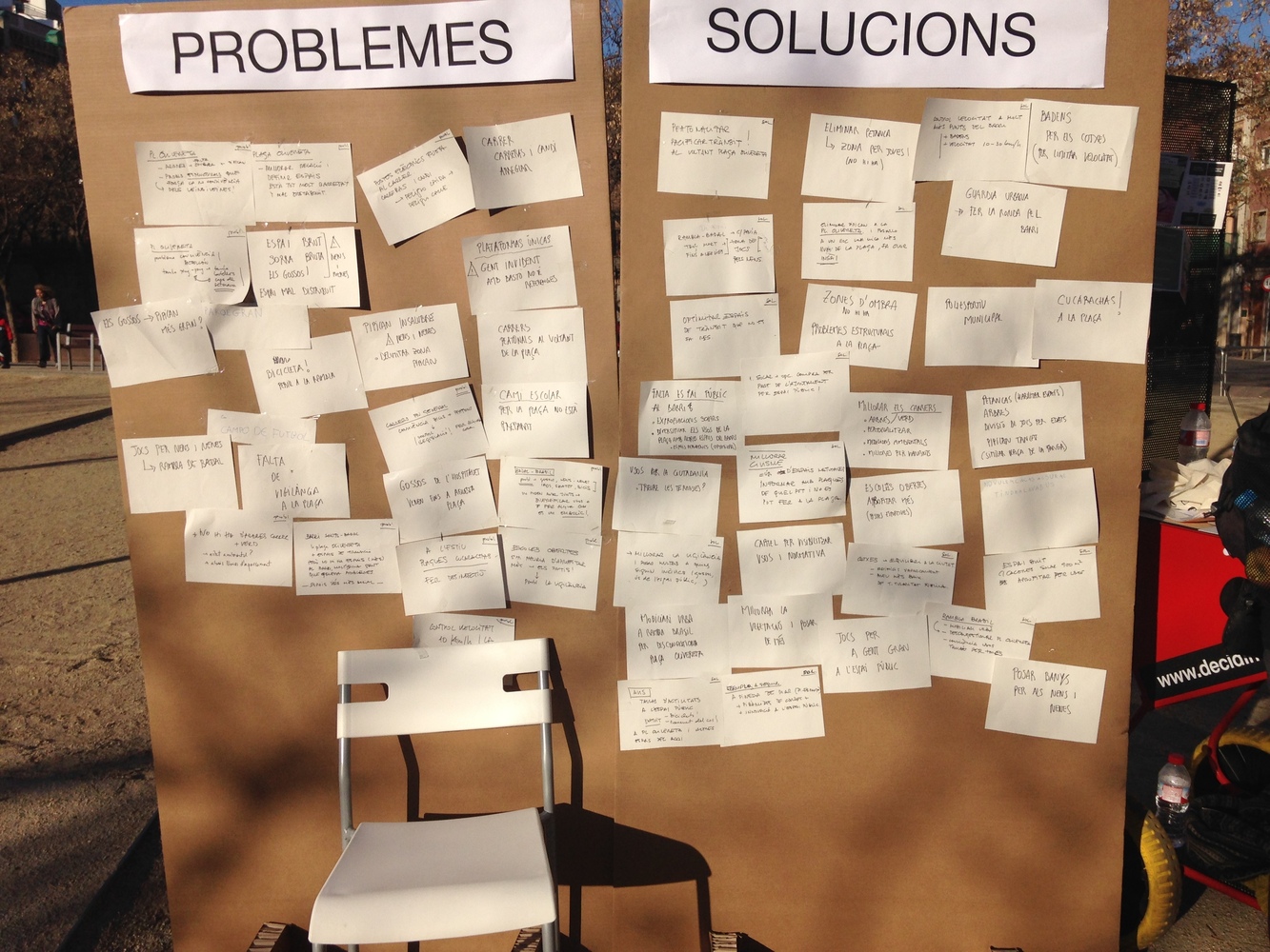RESUM DE LA CITA:Es comença amb una breu presentació del Pla Municipal i de la dinàmica per part de les dinamitzadores. A continuació dues estudiants de l´Institut del barri fan una presentació d´un estudi participatiu de la Plaça Olivereta on es destaquen tant els problemes que hi ha com algunes possibles solucions. Es realitza una primera part de diagnosi en forma de pluja d'idees amb les persones assistents, veïns i veïnes del districte. Les idees es formalitzen en "problemes" i "solucions" al voltant de l´espai públic al barri i concretament al voltant de la Plaça Olivereta. Tant els problemes, com les solucions en forma de proposta, es recopilen i es pengen als plafons. Finalment es fa una recapitulació per part de les dinamitzadores i una validació per part dels assistents.PROBLEMES:DISSENY DE LA PLAÇA: A la Plaça Olivereta estan tots els usos molt barrejats i l'espai mal distribuït. No es potencia la socialització. Problemes estructurals a la Plaça que no potencien la convivència dels veïns i les veïnes. Hi ha inundacions a la plaça ESPAI PÚBLIC AL BARRI: La plaça Olivereta pot ser l´únic espai públic al barri. Falten espais públics amb característiques similars. S'hi haurien d'aprofitar més els patis oberts de les escoles. No hi ha jocs per a nens i nenes a la rambla de Badal.CONVIVÈNCIA: Gossos, nenes i nens, iaios, skaters i bicis no poden anar junts en un mateix espai, com és el cas de la Plaça Olivereta. Caldria diferenciar usos. Els cotxes no fan cas al control de velocitat 10 km/h i hi ha un abús de les línies d´aparcament. Perill de caure els postos elèctrics de fusta al carrer Carreras i Candi. Mala convivència entre bicis i vianants als carrers en general: no hi ha control de les bicis i no s´aplica la legislació. Perill de bicis i vianants a la Rambla. Problemes de convivència: "botellón", drogues.SEGURETAT: Falta de vigilància i seguretat a la PlaçaAUTONOMIA:: El camí escolar no està preparat per la PlaçaACCESIBILITAT: La gent invident no té referencies amb bastó a les plataformes úniquesPIPICAN: L´espai no està delimitat i és petit per a la quantitat de gossos que hi ha. A la Plaça Olivereta venen gossos de l´Hospitalet!INSALUBRITAT I BRUTÍCIA: A l´estiu hi ha plagues de cucarelles. Pipican molt brut. La sorra està molt bruta. VEGETACIÓ: No hi ha arbres al carrer. Falta d´espais d´ombra a la plaçaMEDIAMBIENT: No s´ha fet un estudi mediambiental al barri. Quin és el nivell de pol·lució?SOLUCIONS/ PROPOSTES:DISSENY DE LA PLAÇA: Definir usos i espais de la Plaça.Divisió de jocs per edatsCondicionar l´espai de petanca. Eliminar petanca i habilitar una zona per als joves.Posar banys públics.Jocs més imaginatius per a nens i nenes: Piràmide de cordes a la plaçaESPAI PÚBLIC AL BARRI: Millorar els carrers en general amb més arbres i vegetació, amb millores per als vianants. Peatonalització dels carrers. Pacificar el trànsit al voltant de la plaça. Zona de jocs per als nens i nenes a la Rambla Badal/ Carrer Pavía Eliminar o arreglar pals de llumAprofitar el solar al carrer Caceres de 900 m2 per a fer un espai públic Aprofitar els oberts de les escolesFer edificis d´aparcament de titularitat publica, en comtes d´aparcar al carrerExpropiar solars per fer més espais públics al barri Diversificar els usos de la plaça Olivereta amb altres espais del barri. Descentralització i diversificació d´usos optimitzant els espais més perifèrics. Mobiliari urbà a Rambla Brasil per descongestionar la plaça Olivereta.Programar activitats i habilitar zones de jocs per a la gent gran a l´espai públic..VITALITAT I CONVIVÈNCIA: Vincular les festes del barri amb la plaça OliveretaMercat ambulant a la plaçaTreure les terrasses a la plaça i potenciar els usos per a la ciutadania.SEGURETAT: Controlar la velocitat dels cotxes amb ressalts.Que la guàrdia urbana faci la ronda al barri.Millorar el civisme amb plaques informatives a la plaça on posi que és el que es pot fer i que és el que no. Cartells informatius amb usos i normatives.Millorar la vigilància i posar multes a tothom que sigui incívicPIPICAN: Delimitar pipican i fer-lo més gran. Tancar pipican (similar a la plaça de la Farga) Eliminar el pipican a la plaça Olivereta i posar-lo més lluny. Fa olor insà.VEGETACIÓ: Posar més arbres a la Plaça. Ficar més boniques les plantes. En general posar més vegetació i verd a l´espai públic, carrers i plaça.MEDIAMBIENT: Fer un estudi ambiental al barri.