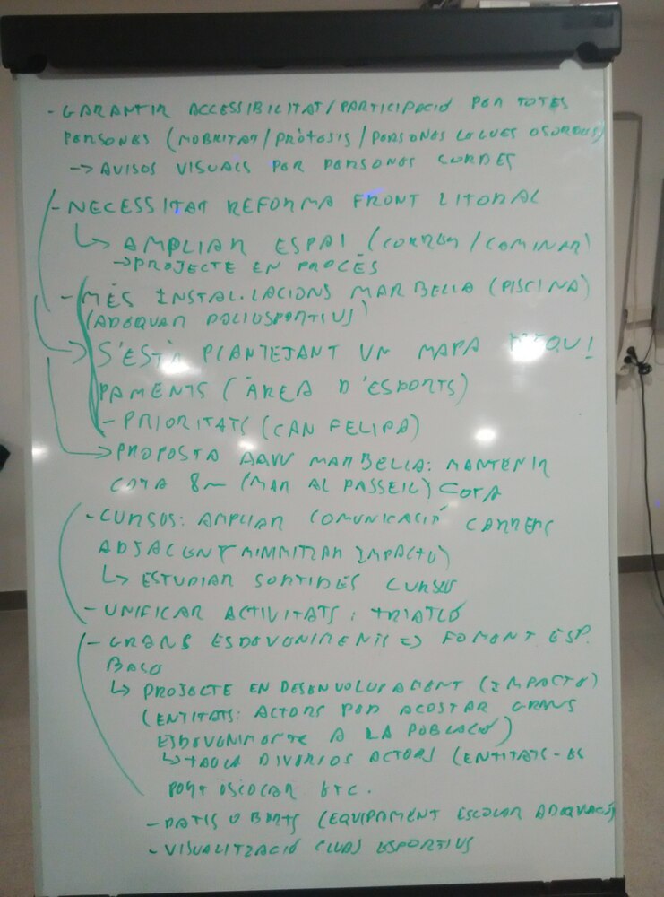 Acabar el passeig MarítimMillorar l'eficiència energètica i l’accessibilitat de la xarxa d’equipaments esportius municipalsPla de promoció de l’activitat esportiva ciutadanaMapa d’instal·lacions esportivesGestió comunitària de l'equipament esportiu de la pista Pujades-AgriculturaTaula de mobilitatDonar suport al teixit associatiu esportiuFomentar la pràctica d'activitats esportives en l'espai públicEncarregar el projecte d'ampliació i trasllat del CEM Can FelipaRevisar i replantejar les subvencions, ajudes i convenis dels esdeveniments esportius de la ciutatPla "Barcelona esport en edat escolar"Projectes i Pla comunitari Besòs-MaresmePatis i equipaments obertsActa de la trobada