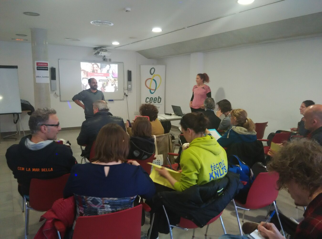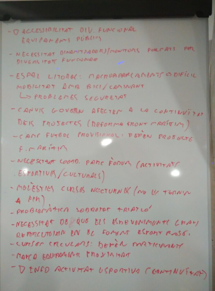 Gairebé la meitat dels i les assistents al debat pertanyen a alguna entitat esportiva o a alguna entitat veïnal.Una de les afectacions expressada pels veïns i veïnes té a veure amb la degradació del passeig litoral, per una banda es manifesta el problema dels macro aparcaments els quals dificulten la mobilitat en bicicleta i a peu dels vianants a més que genera problemes de seguretat. I d’altra banda es planteja la qüestió dels camps de futbol provisionals que acaben sent permanents i que trenquen amb la continuïtat del passeig.De manera general en relació al projecte del Front Marítim, els i les participants al debat expressen la dificultat de continuïtat del projecte degut als canvis de govern, els quals haurien de ser independents al projecte de reforma del Front Marítim.Es tracta també el problema de coordinació dels esdeveniments al parc del Fòrum, ja que són professionals diferents els que porten els esdeveniments esportius i culturals i això finalment afecta la planificació de les activitats.El debat s’ha centrat principalment en els grans esdeveniments esportius al districte, concretament les curses. Els veïns i veïnes demanen que no es tornin a convocar curses nocturnes, ja que generen moltes molèsties i que els triatlons són les curses amb més perillositat per la convivència al barri, principalment per les bicicletes. Aquests macroesdeveniments necessàriament han de repercutir en el foment de l’esport de base, i en el foment de la pràctica esportiva en infants, adolescents i joves.Els i les assistents al debat manifesten la manca d’equipaments de proximitat esportius al districte, principalment al barri de Diagonal – Front Marítim on l’equipament de referència, Mar Bella, està pensat per l’ús i lloguer d’instal·lacions per als esports d’equip , i no per oferir activitats d’esport individual pels veïns i veïnes el barri. A més, es percep una manca de continuïtat del cicle esportiu sobretot en edat infantil entre el currículum lectiu i no lectiu, així com una manca d’informació envers l’oferta esportiva al districte i al barri.Per últim en relació a les persones amb diversitat funcional, es reflexiona envers la manca d’accessibilitat d’aquestes persones als equipaments públics de manera autònoma, així com la necessitat d’incorporar més professionals amb formació en diversitat funcional per cobrir les necessitats d’aquests usuaris i usuàries com a dinamitzadors o monitors.