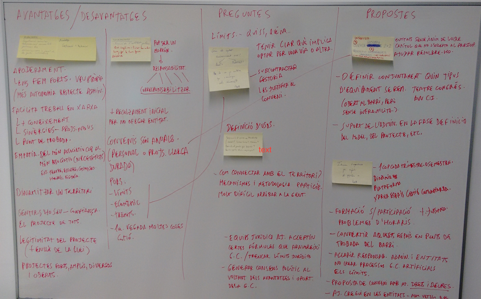 La sessió s'ha dut a terme al Casal de Barri Ateneu L'Harmonia i això ha marcat força el desenvolupament de la cita, atès que en els darrers mesos, des de la seva posada en funcionament, s'ha convertit en tot un referent en la gestió comunitària d'equipaments a la ciutat.Van assistir a la cita representants de diferents entitats, tant del districte com de fora d'ell, a més de tres consellers del districte. Algunes de les entitats participants van manifestar la seva intenció d'aspirar a assumir la gestió externalitzada d'un equipament a través de la fórmula de la gestió cívica.La sessió va tenir dues parts. Una primera de presentació de la jornada de treball, manifestant la voluntat política en relació amb la gestió cívica d'equipaments i serveis públics, amb una intervenció que havia de servir de marc introductori al voltant de la gestió cívica i de l'experiència concreta de l'Ateneu Harmonia. La segona part va consistir en un treball en petits grups per expressar una triple dimensió: els avantatges i els desavantatges que pot tenir la gestió cívica o comunitària, els interrogants que els generava el fer aquest pas i, en darrer lloc, les propostes que farien arribar a l'Ajuntament per incloure-les tant al PAM com al PAD de Sant Andreu.Es va acabar el taller amb un debat entre tots els i les participants que va ser molt enriquidor i necessari, arribant a manifestar tots els assistents la proposta que cites semblants es realitzin més sovint, des d'espais de coordinació d'entitats que duen a terme experiències de gestió cívica.