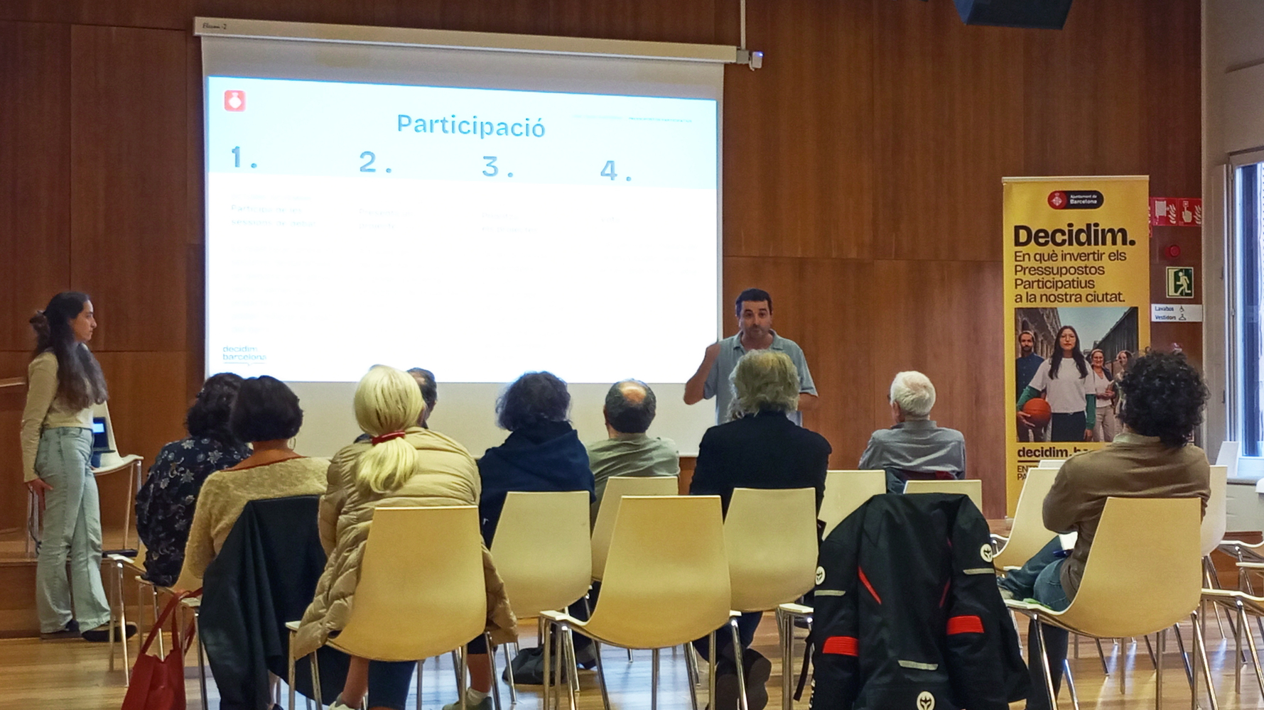 La primera part de la sessió va estar destinada a explicar els objectius, les fases i els canals de participació del procés dels pressupostos participatius de l’Ajuntament de Barcelona. Es va mostrar la plataforma “Decidim Barcelona” i explicar els criteris per tal de presentar-hi propostes.