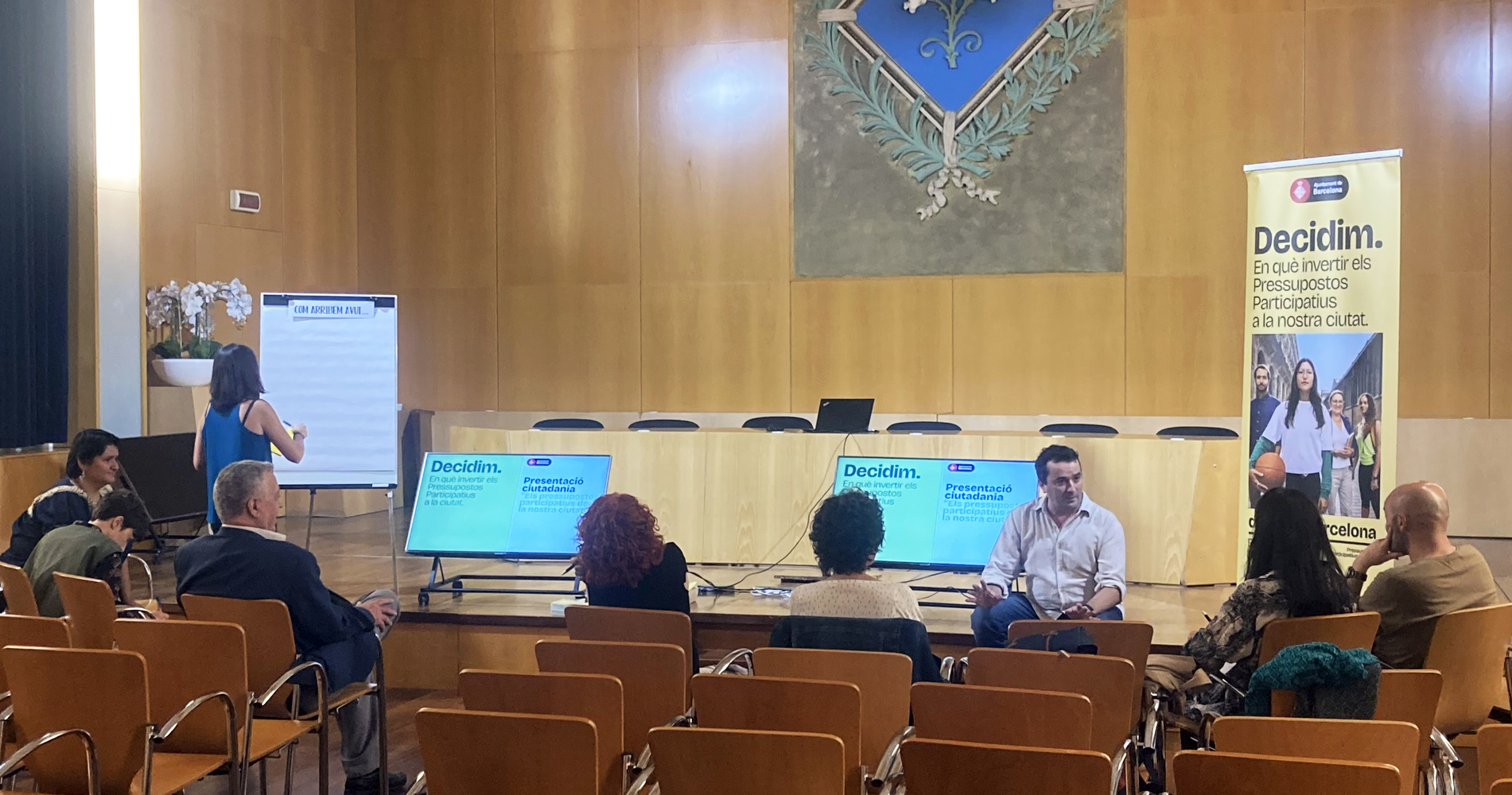 La primera part de la sessió va estar destinada a explicar els objectius, les fases i els canals de participació del procés dels pressupostos participatius de l’Ajuntament de Barcelona. Es va mostrar la plataforma “Decidim Barcelona” i explicar els criteris per tal de presentar-hi propostes.