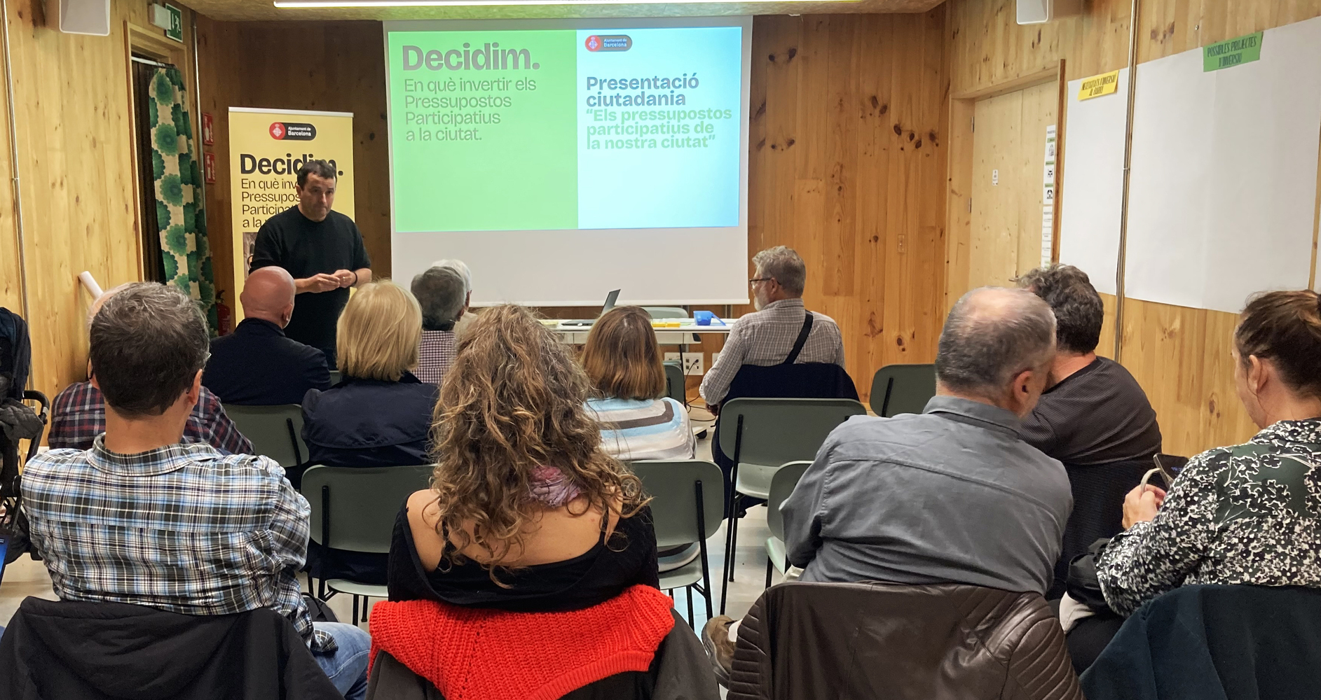 La primera parte de la sesión se destinó a explicar los objetivos, fases y canales de participación del proceso de los presupuestos participativos del Ayuntamiento de Barcelona. Se explicaron los criterios para presentar propuestas, haciendo mucho inciso tanto en aquello sobre lo que sí se pueden hacer propuestas (proyectos de inversión) y aquellos temas que quedan fuera del ámbito de los presupuestos participativos.