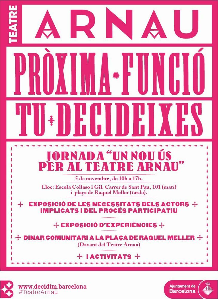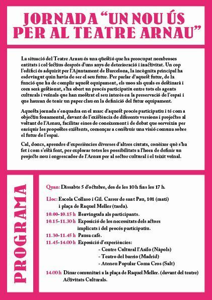 Mati de debat sobre les propostes d'us del Teatre Arnau, amb les aportacions de tres equipaments similars de Madrid, Salt i Nàpols. Al Migdia es farà un dinar comunitari a la Plaça Raquel Meier hi hauran intervencions artístiques.
