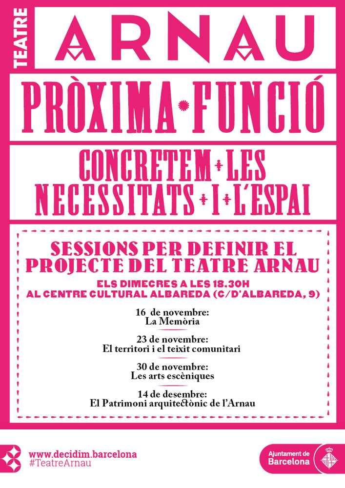 Sessió de treball amb el Grup Impulsor per tractar l'àmbit o l'eix de les arts escèniques. L'objectiu de la sessió és el de reflexionar sobre el paper de les arts escèniques en el projecte cultural del Teatre Arnau