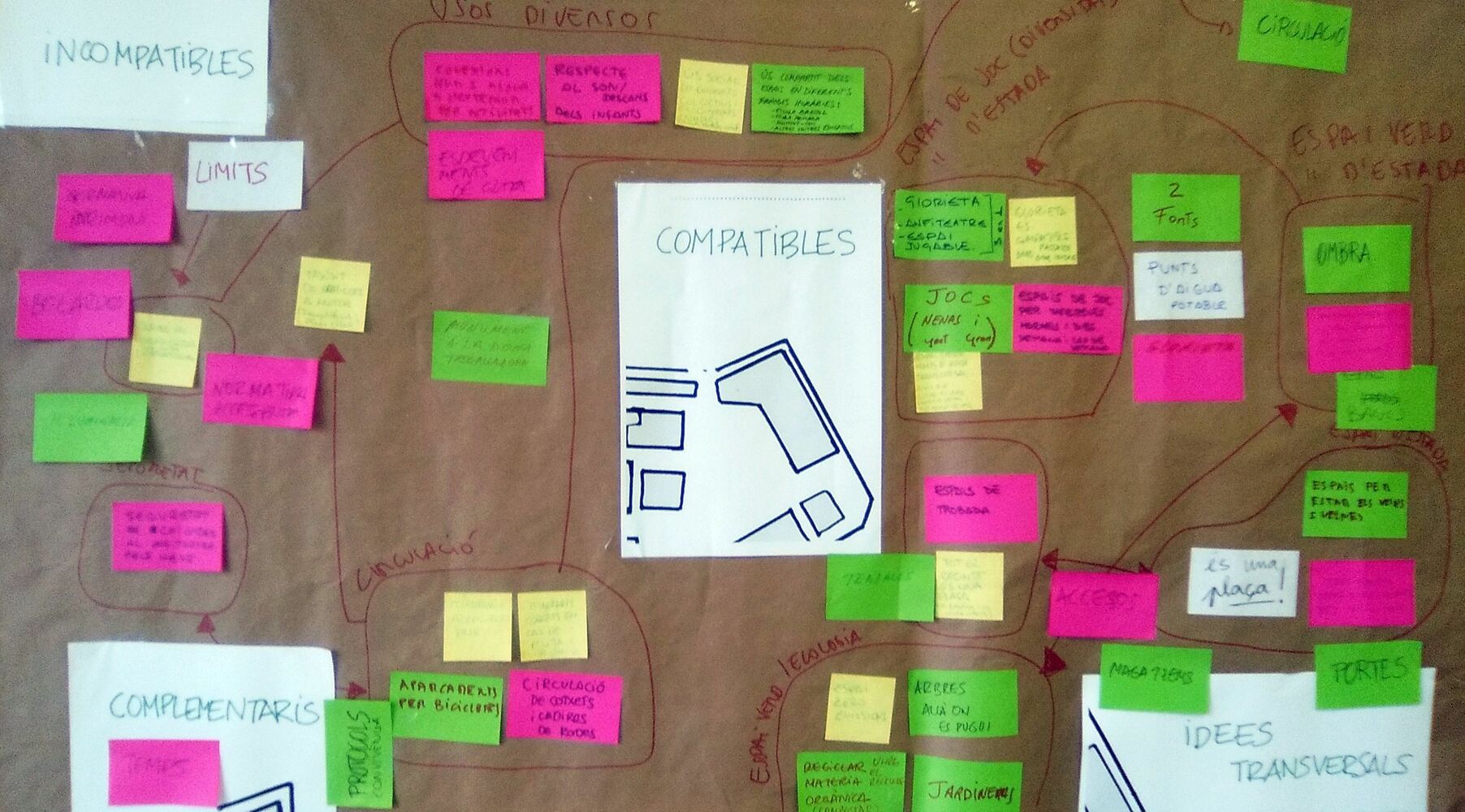 Es va dur a terme una dinàmica de treball compartit de tots els assistents per a aplicar la idea d’usos complementaris”, “usos compatibles” i “usos incompatibles” a casos concrets del recinte i començar articular diferents àrees de treball que parteixin de les necessitats o propostes expressades per les entitats i persones participants.