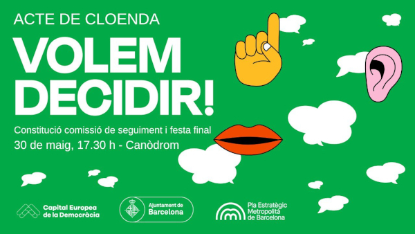 Coneixerem les conclusions finals del procés Volem decidir i en farem entrega als representants polítics de l'Ajuntament de Barcelona. Veurem el vídeo del procés. Constituirem la Comissió de Seguiment que vetllarà perquè les propostes es duguin a terme i ho celebrarem tot amb un berenar, bingo musical i ballaruca.